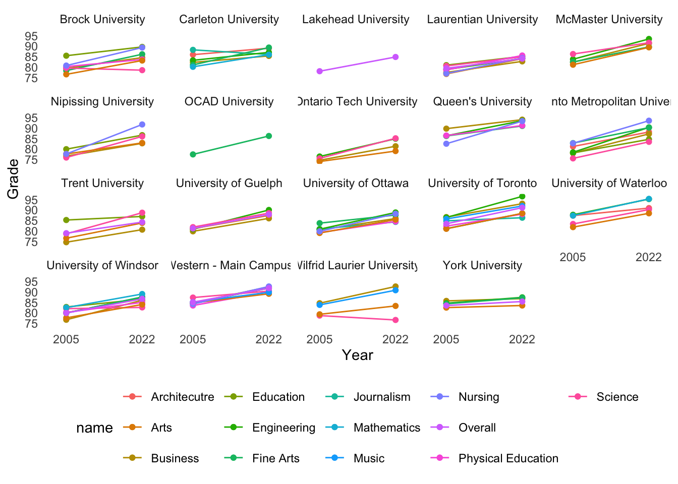 Here is the graph of the overall averages by university. This is the best comparison, probably. Western University and University of Toronto had the highest averages in both years and those grades went up by about eight percentage points, just eyeballing. Interestingly, York University’s entrance average stayed pretty flat.