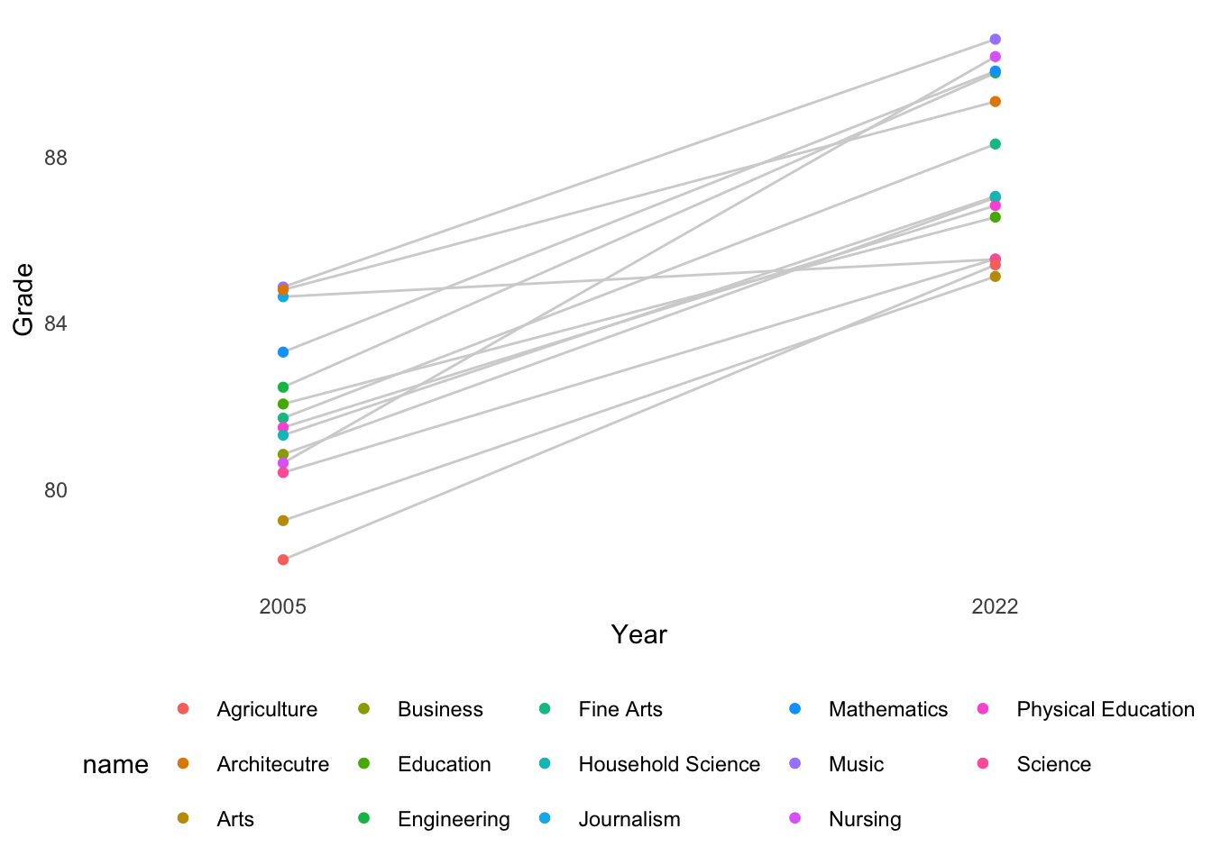 Here is a more elaborate graph that shows grade inflation only by field of study, averaged by university. The only field that seems to be holding the line is mathematics.